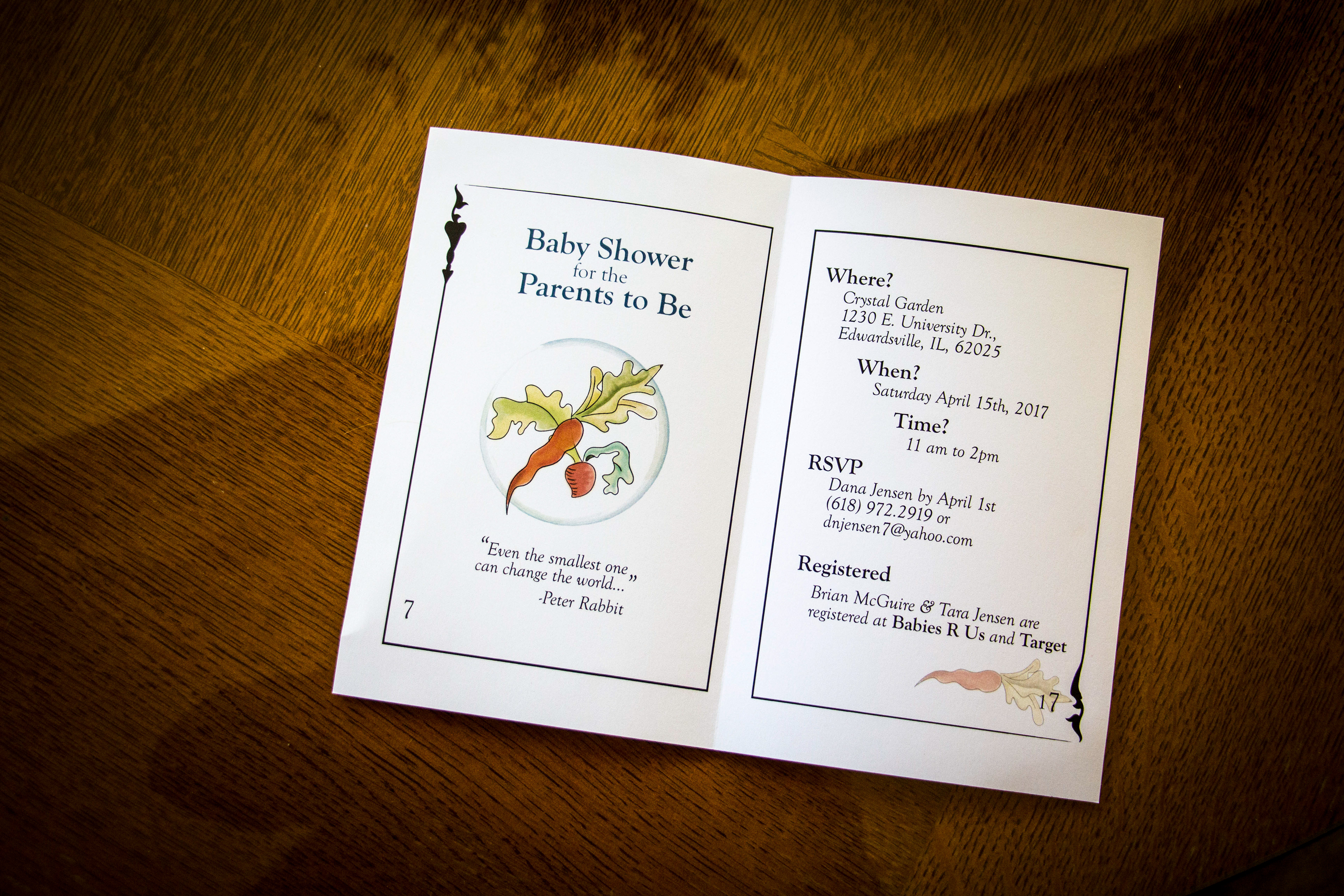 Invitations created for baby shower that was themed after the famous children's books, Peter the Rabbit by Beatrix Potter. Hand-illustrations and designs all done originally.
